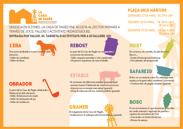 una quinzena d’activitats i tallers, alguns d’ells gratuïts i d’altres de pagament. HORARIS i TARIFES: Divendres de 17h a 20h PREU TIQUET 1 TALLER: 2€ Venda de tiquets a taquilla el mateix dia de l'activitat
